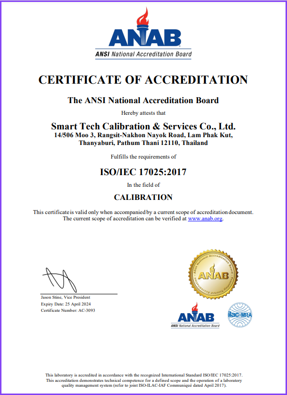 บริษัท สมาร์ทเทค แคลิเบรชั่น แอนด์ เซอร์วิสเซส จํากัด ได้รับรองมาตรฐานห้องปฏิบัติการ ISO/IEC 17025 : 2017 จาก ANSI National Accreditation Board (ANAB) ประเทศสหรัฐอเมริกา ให้บริการสอบเทียบเครื่องมือวัดทั้งภายใน และภายนอกสถานที่ภายใต้การควบคุมดูแลของทีมงานสอบเทียบที่มีความรู้ ความชำนาญเฉพาะด้าน ในแต่ละสาขาการวัด เพื่อให้การสอบเทียบมีคุณภาพ ภายในระยะเวลาที่กำหนด